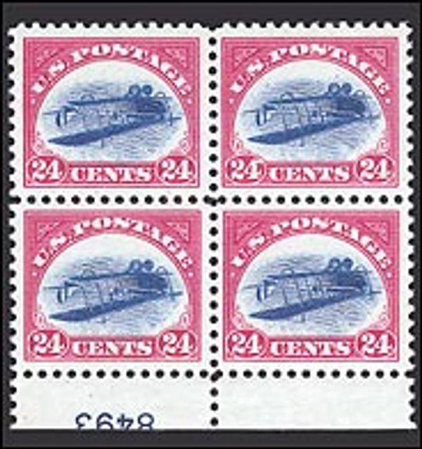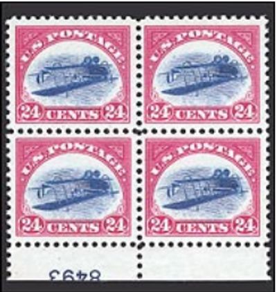 The unique 1918 Jenny INVERTED CENTER Plate # Block of Four sold for nearly $5 million in 2014.