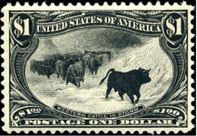Considered one of the most beautiful stamps, this $1 Cattle in the Storm (from a John MacWhirter painting)