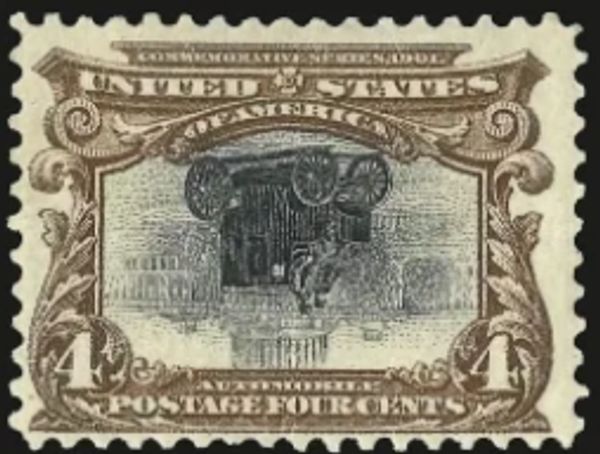 The 4¢ 1901 Pan-American Exposition INVERTED CENTER depicts an early electric car -- the first automobile
